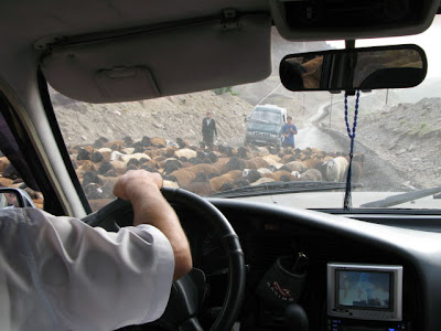 On Tuesday the 24th we traveled from Dushanbe to Khorog. It was 19 hours by car, going high up into the mountains. Packed 5 in a car it was quite cozy. The road was alternately paved, stones, and dirt. No matter what the surface there were always lots of potholes.  The road twisted and turned around the moutains and up and down the valleys and passes. This is the main road from China to Dushanbe and points west and goes along the Afghanistan border.